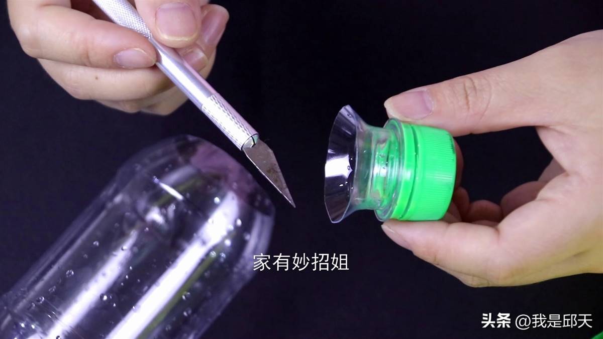 接着,我们再把塑料瓶改造一下,把塑料瓶瓶口下方两厘米的位置给它剪掉,这样一个塑料瓶就改造好了。