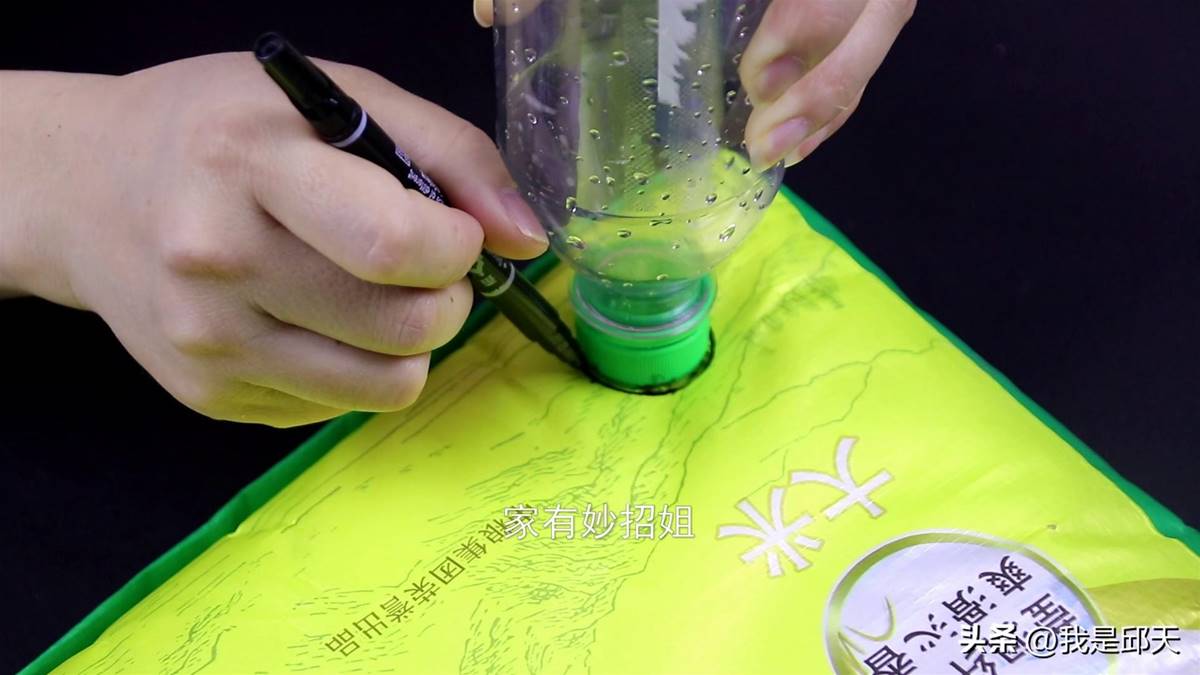 我们先把塑料瓶瓶口的位置比在米袋的下半部分,然后用记号笔沿着塑料瓶的瓶口,在米袋上标记一个圆形。