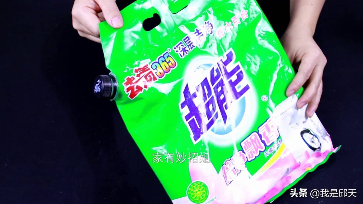 这个塑料瓶除了可以把它固定在米袋上,我们还可以把它粘在洗衣粉的包装上。洗衣粉也是我们家里经常需要使用到的,平时我们购买的洗衣粉通常都是一大包的,一包洗衣粉都要用上好几个月。
