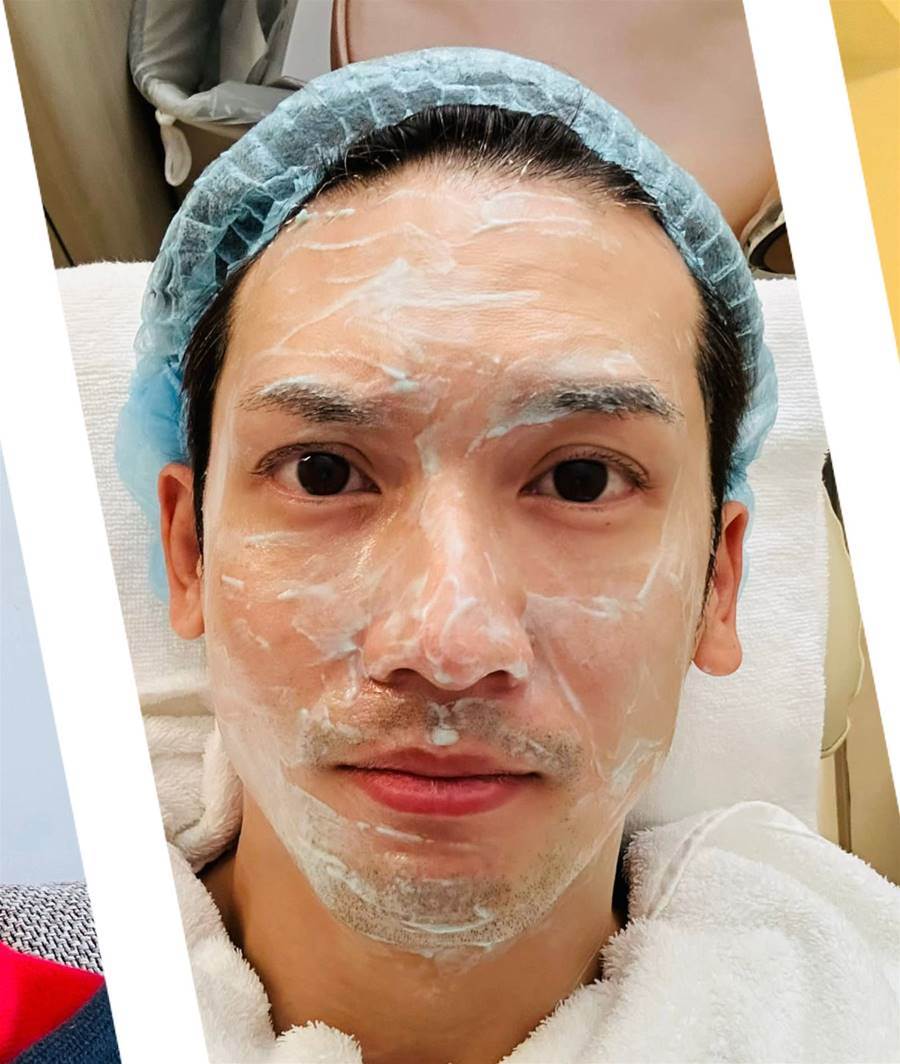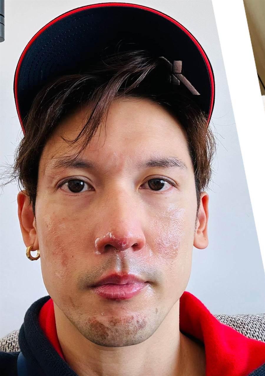 關智斌分享康復期臉上涂滿藥膏的照片,眉毛有明顯剪過的痕跡。