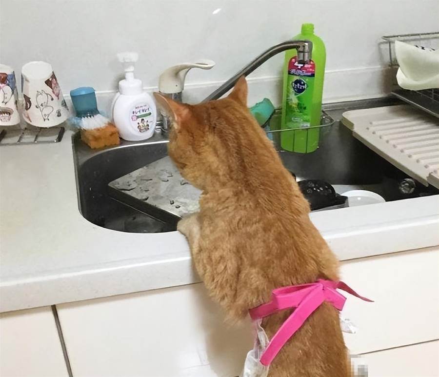 「吃完飯,洗碗也是我的工作,有我這麼乖的小貓咪嗎?主人快夸夸我吧」!