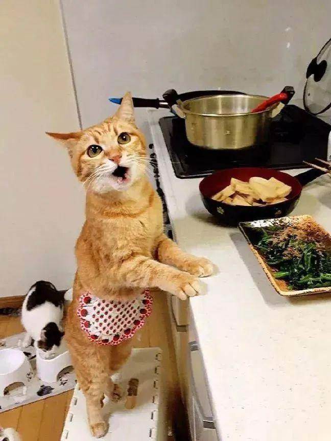 10、貓咪跟人類生活久了,還學會了做飯,穿上圍裙的樣子,像極了廚師。