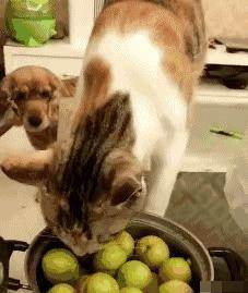3、貓咪跟人類生活久了,還學會了交朋友。這只貓咪想跟狗狗交朋友,看到好吃的,居然還會想給狗子叼一個,這「人情世故」拿捏得死死的。