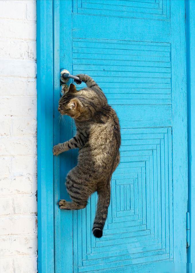 1、跟人類生活久了,有些貓可能早已把自己當成人了吧,你看,它們已經學會了如何開門!用身體把門把手壓下,輕松打開門,這單手開門的姿勢有點帥,是這麼回事?